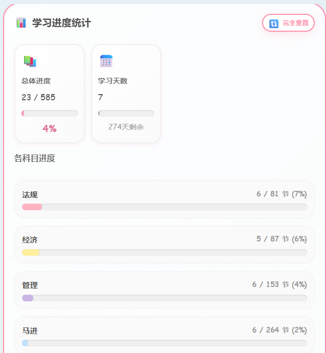 - 完全重置 :点击"完全重置"按钮,清除所有数据并重新生成学习计划