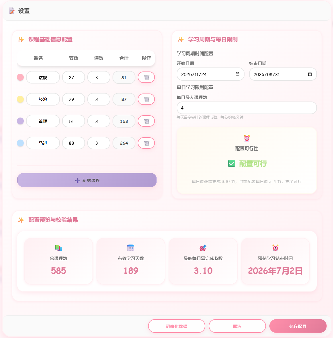 - 课程配置 :调整各科目总课时、每日学习限制等参数